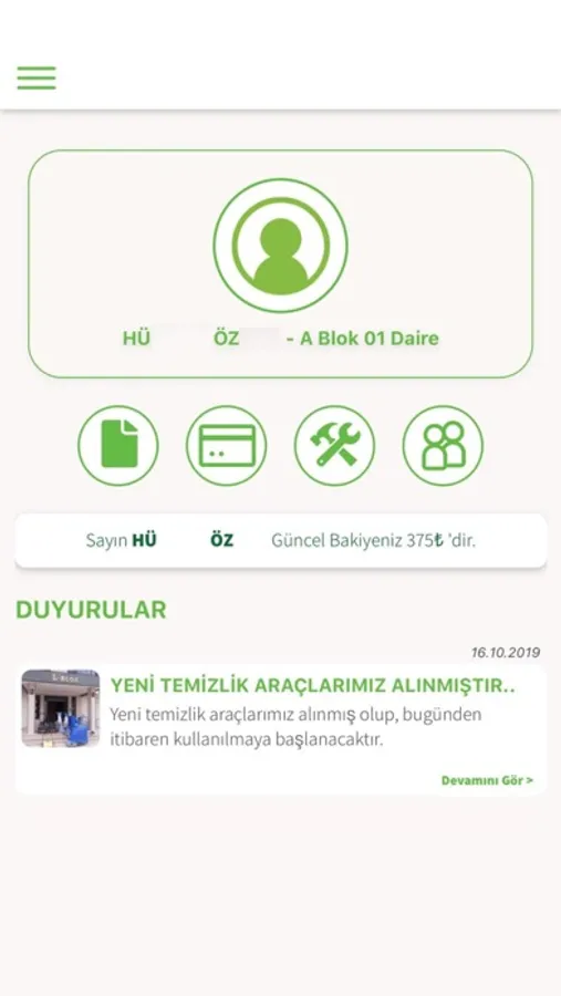 · Duyurular : Yönetimin malik ve sakinler için yaptığı tüm duyuruları görüntüleyebilirsiniz.