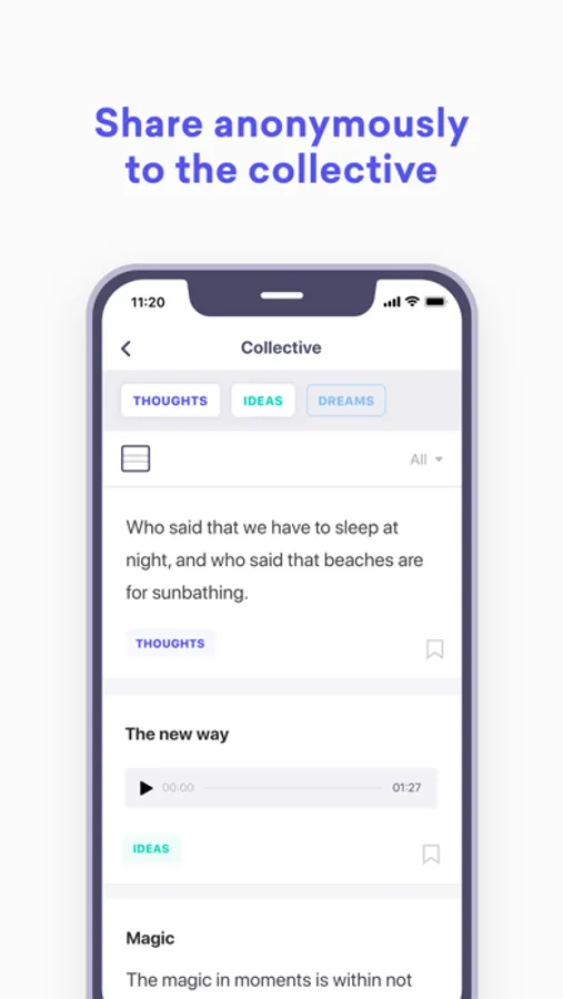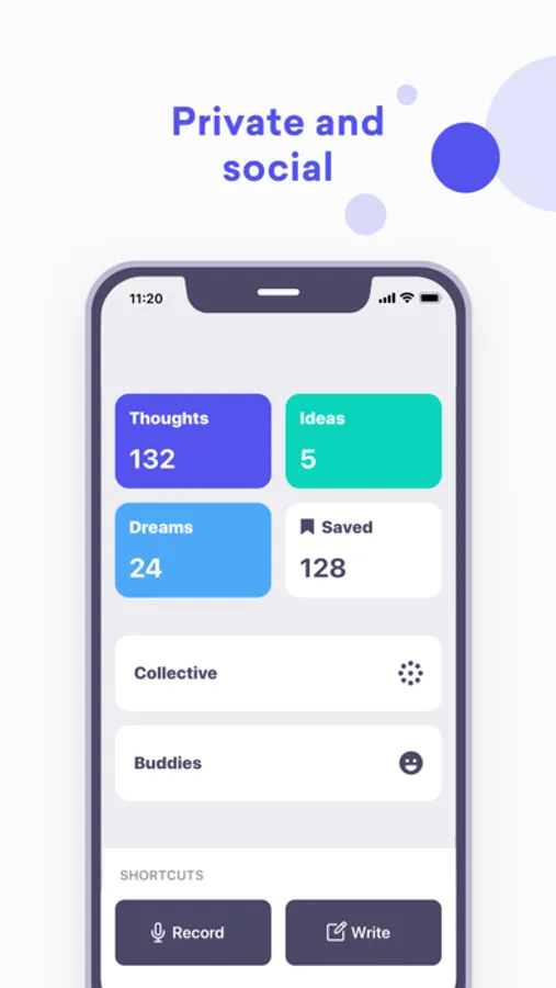 You can write your thoughts, ideas, and dreams, and also record them as voice memos. You also have the ability to share your thoughts with the Collective and Buddies.
