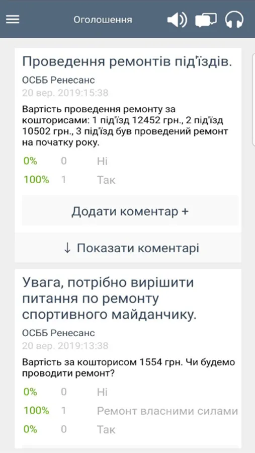 ОСББ, управителі, співвласники. Перегляд та оплата комунальних послуг, контроль за витратами, перегляд виконаних робіт у будинку. Новини та повідомлення від голови ОСББ, оголошення та опитування, коментування. Спілкування зі співвласниками. Обговорення поточних питань.