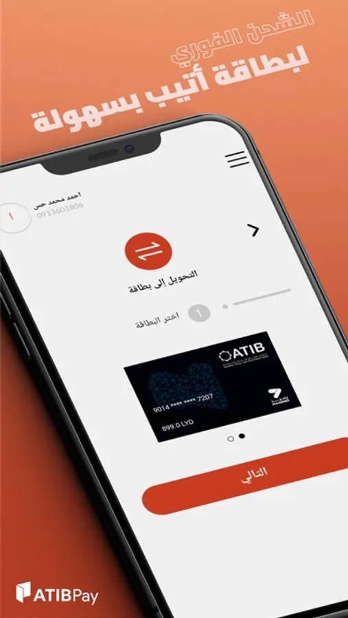 عبر تطبيق أتيب PAY، يمكنك شحن بطاقة أتيب بالدينار الليبي مسبقة الدفع، من محفظتك الرقمية إلى بطاقتك، أو من بطاقة إلى أخرى فورًا دون أي انتظار!