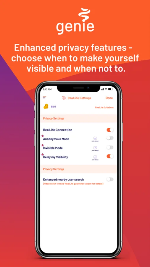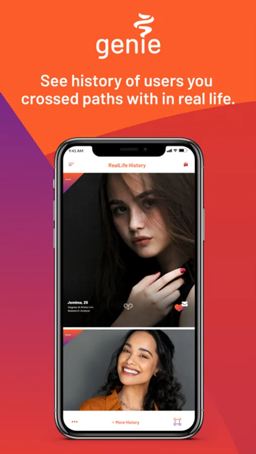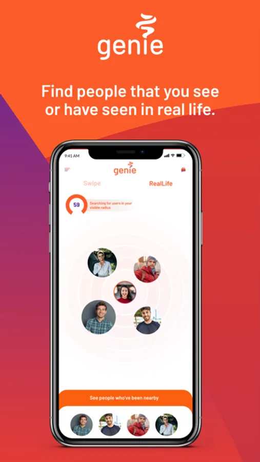 Genie is a dating app which allows users to search for other users in immediate vicinity. It uses bluetooth to show users to other prospective matches. Users can filter for users that they want to see on the basis of gender and various other privacy settings.