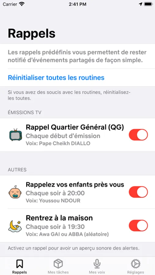 - Activez les rappels prédéfinis pour être notifié•e par des voix célèbres (ex: Youssou Ndour, Pape Cheikh Diallo...) lors d'événements divers (approche du couvre-feu, début d'une émission et plus)
