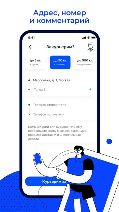 ⁃ Курьер на машине: поможет с коробками, хрупкими вещами и посылками до 50 кг;