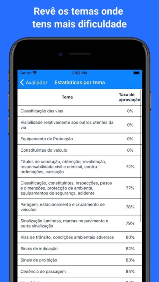 Caso queiras focar o teu estudo nas categorias onde tens mais dificuldades podes fazer um teste temático. Aqui tu escolhes quais os temas que queres incluir no teste.
