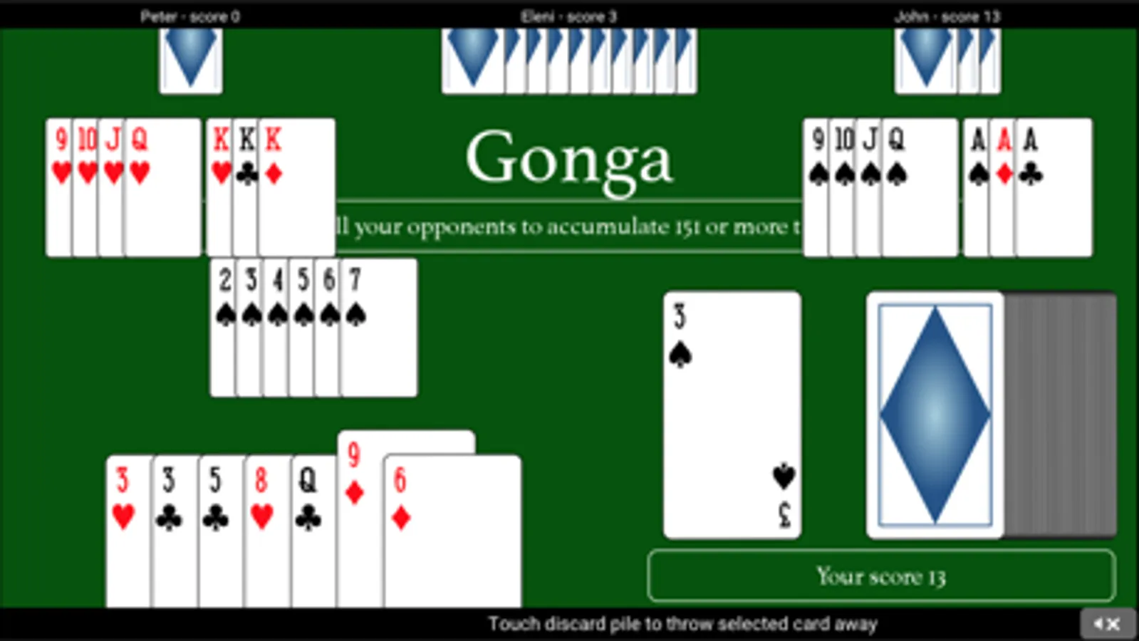 Gonga is a game based on Gin / Rummy played with 10 cards for points over multiple hands.