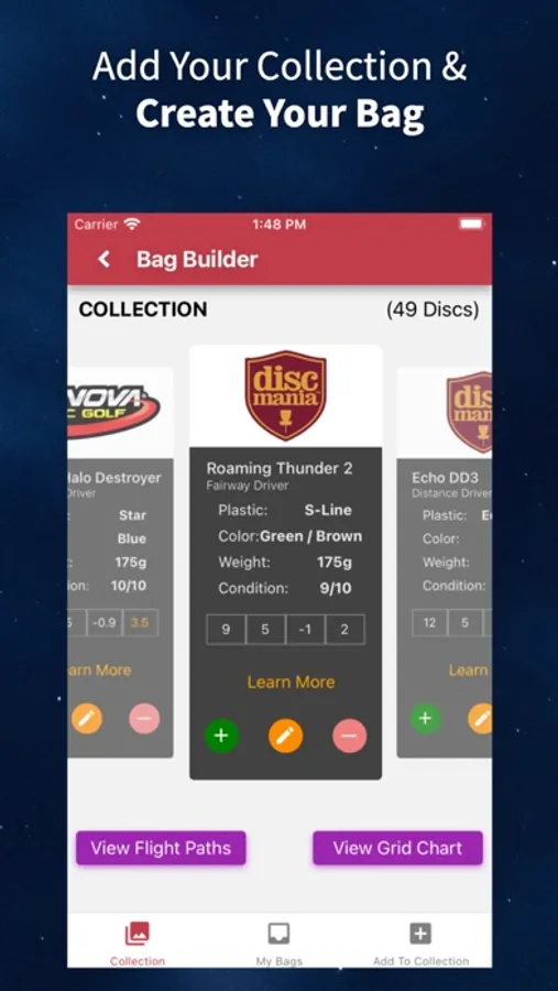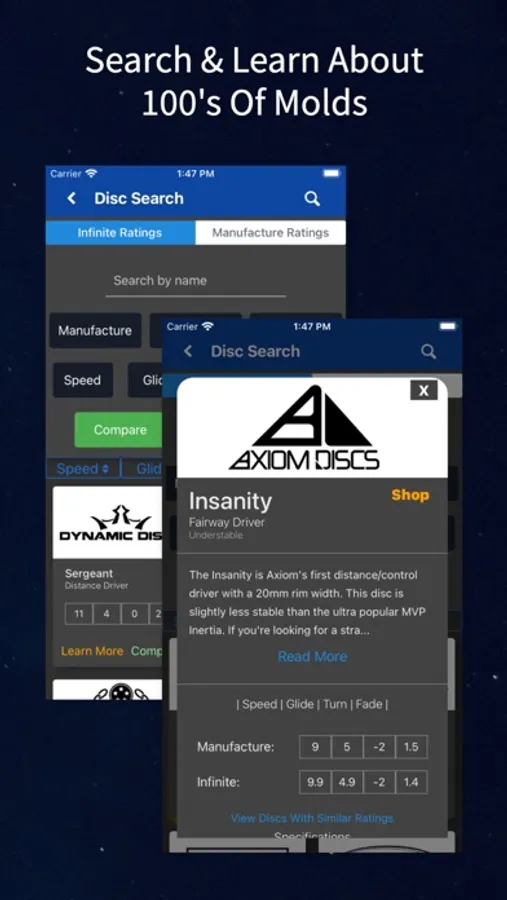One of the biggest factors to improving your disc golf game is learning about different discs, how they fly and how you should use them for your game. There's over 700 different discs on the market made by over 30 different manufactures! Our disc search app puts all those discs in one place so you can easily find and view information, including their flight ratings, about any disc on the market.