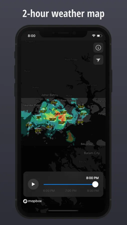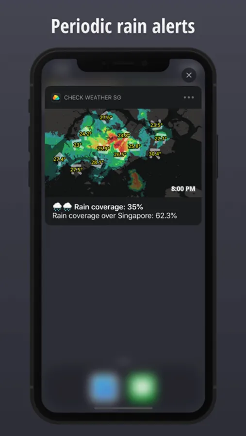 Tap on ⓘ to enable rain alert notifications. Push notifications are sent every time there's significant rain cloud coverage over Singapore, from the beginning, all the way until the rain goes away. Notifications are sent periodically with coverage percentage information to give a sense of how the clouds move and how fast the rain goes by.