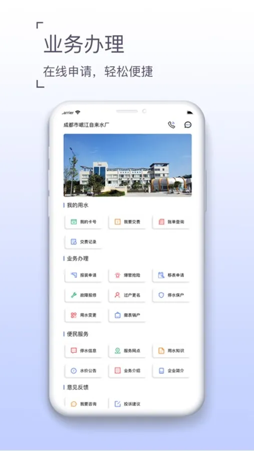 本APP产品为成都市岷江自来水厂网上营业厅,为成都市岷江自来水厂的用水用户提供在线账单查询、在线交费、停水公告、在线申请等服务。让用户足不出户就可轻松交费、获取信息、办理业务申请。