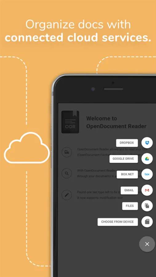 You can open files from ODF (ODT, ODS & many more) that you have created with Libre Office or OpenOffice also from within other apps. Supported apps include GMail, Google Drive, iCloud, OneDrive, Nextcloud, Box.net, Dropbox and lots of others! Or use our integrated file explorer instead to open files on your device.