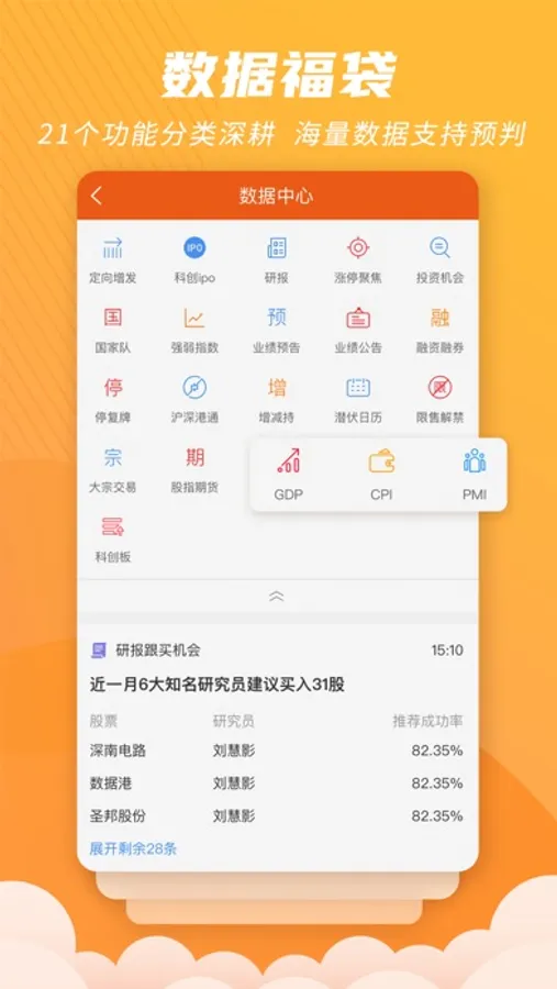 4、数据福袋——通过大数据分析技术对市场股票进行分析统计,包括潜伏日历、涨跌风向标、龙虎榜、强弱指数、交易提示、投资机会等智能工具,深度挖掘个股,为您的每一次投资保驾护航。