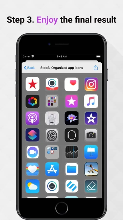 Are you tired of messy app icons on your Home screen? Want to be more organized and productive? Here comes this app for helping you organize it easy. Just follow the three steps and enjoy a fantastic result.