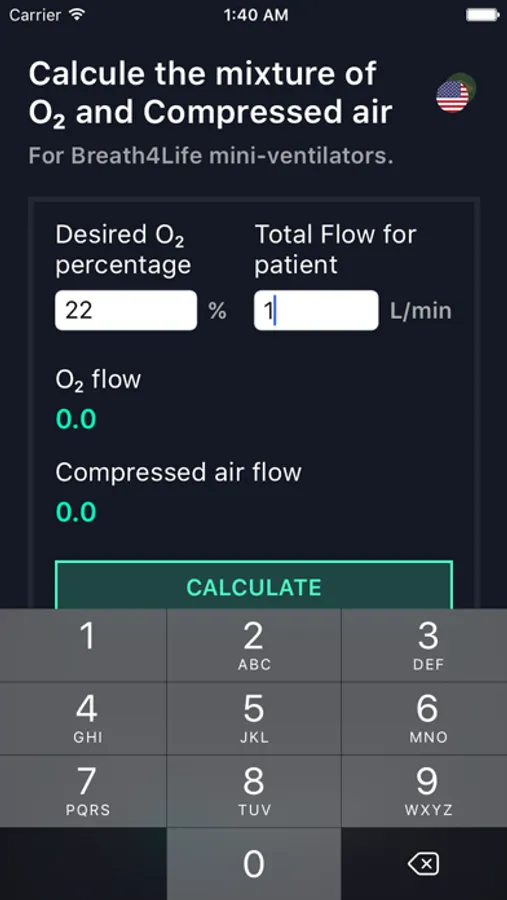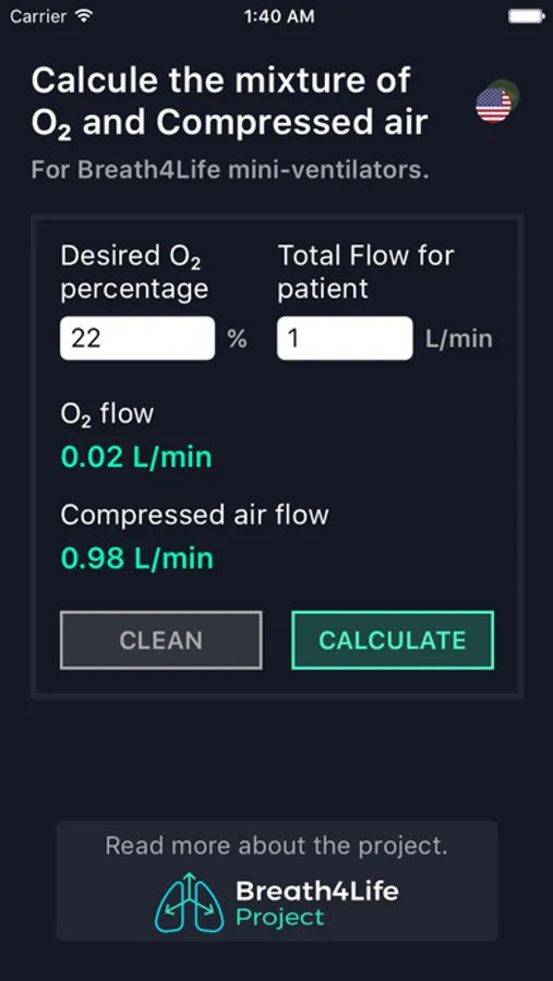 The purpose of this application is to assist in the calculation of the mixture of oxygen flow and compressed air for the Breath4Life mini ventilators.