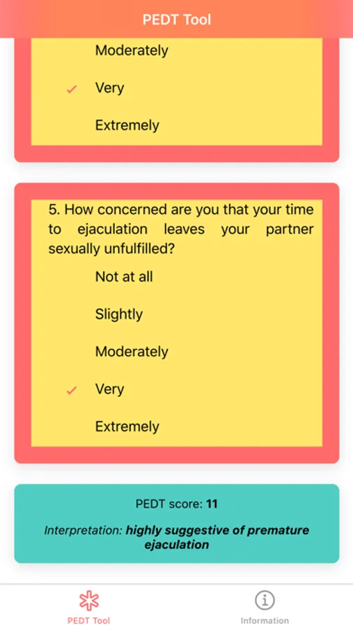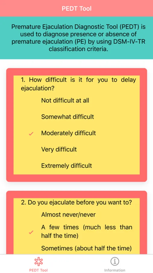 "Premature Ejaculation Tools - PEDT Questionnaire Diagnosis" is an app designed for health practitioner to identify men who may have premature ejaculation (PE) during sexual activity. Diagnosis of premature ejaculation in this "Premature Ejaculation Tools - PEDT Questionnaire Diagnosis" app is based on the premature ejaculation diagnostic tool (PEDT) questionnaire, a brief diagnostic measure to assess premature ejaculation (PE). "Premature Ejaculation Tools - PEDT Questionnaire Diagnosis" will help to identify premature ejaculation (PE) because premature ejaculation (PE) is a highly prevalent condition that affects men sexual health. The prevalence of premature ejaculation (PE) varies by different areas and diverse definitions, with 20%–40% of adult men suffering from this embarrassing disease.