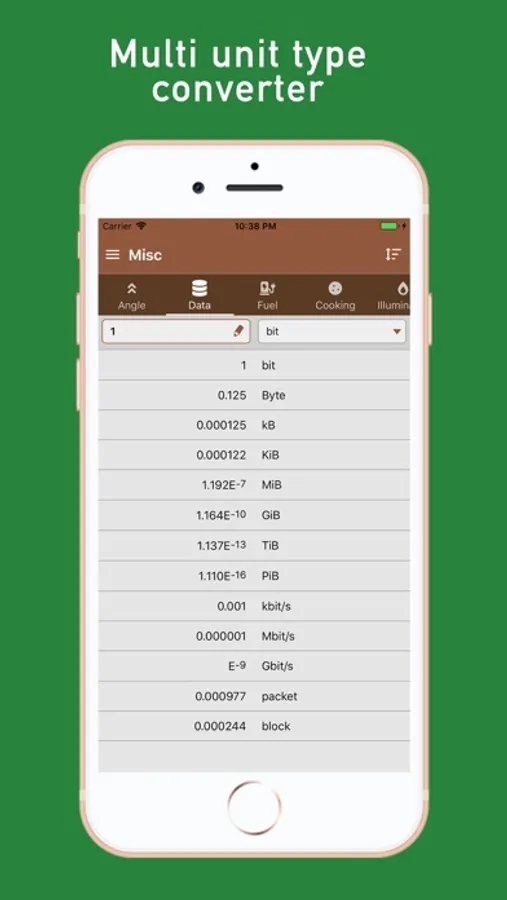 - Misc. : angle, data, fuel efficiency, cooking, illuminance, radiation, prefix, binary, time zone, blood sugar, hardness, AWG