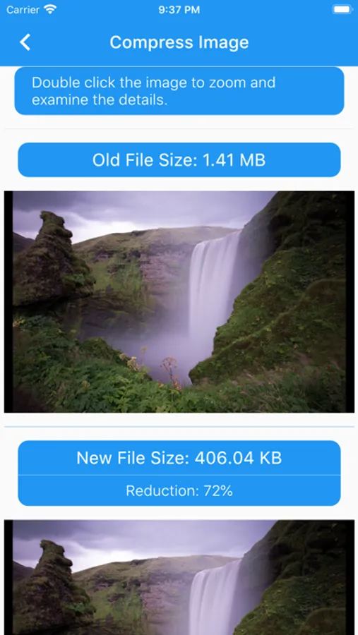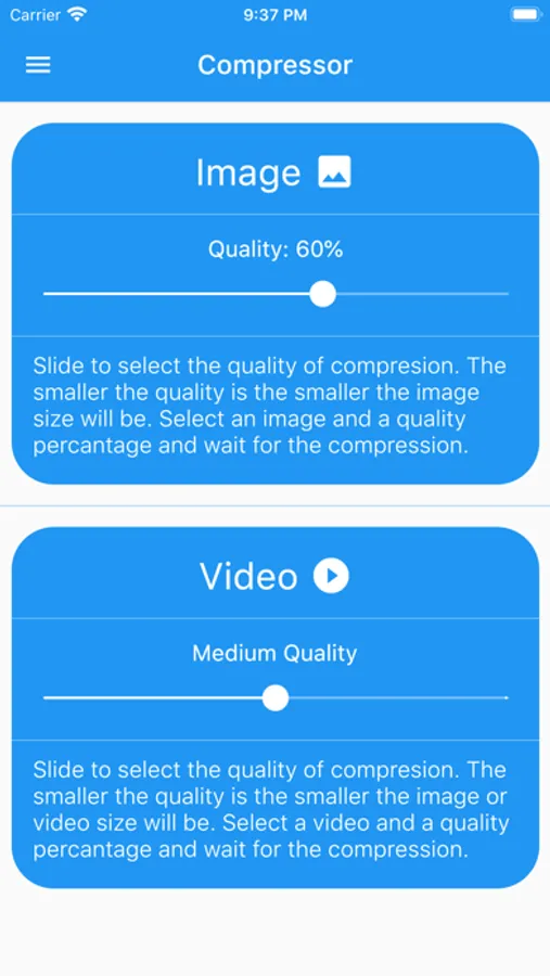 Compressor is an app that reduces the size of your images and videos. Save storage space with Compressor. Select the quality and the image or video. The compression will start and you may compare the images or videos.