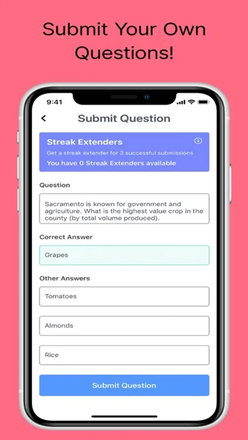 Are you a trivia god? Crack open that well of knowledge and submit your own questions to earn bonus streak-extenders and keep that winning streak going. Puzzle your friends with your superb knowledge!