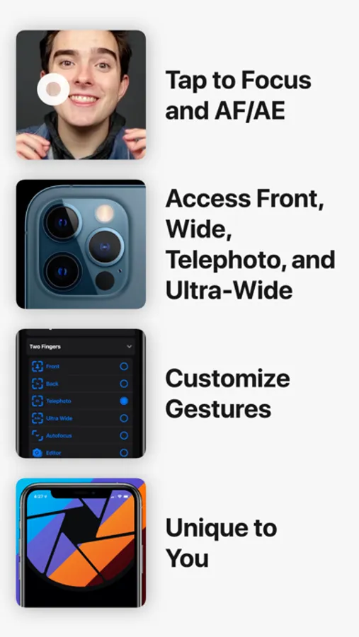 - Access all cameras including Front, Back, Telephoto, and Ultra-Wide