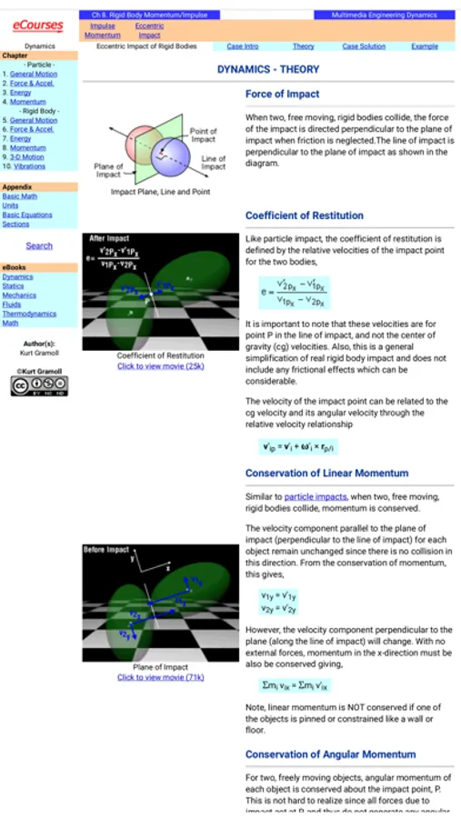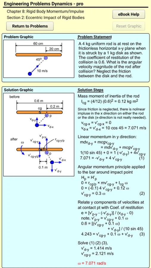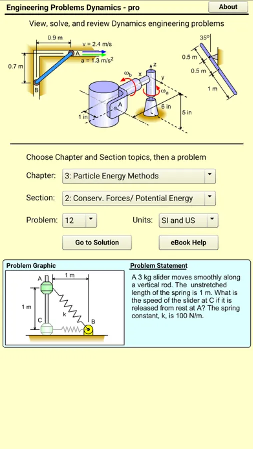 'Eng Dynamics' app provides real homework and test problems for the common engineering course called Dynamics. All problems are organized in sections and chapters common to most textbooks. Each problem has a complete solution with graphics to help you better understand how to solve the problem. Also, each problem has a link to a theory web page for that section at the online eBook (eCoursesBook.com). There is no cost for the online eBook, and it can be accessed outside of the app.