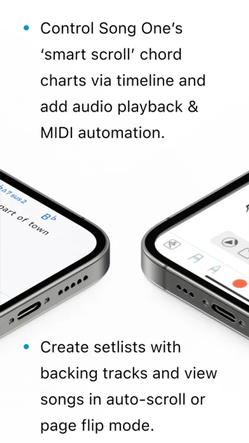 Quickly flip through hundreds of song sheets and create custom setlists with backing tracks. Stay organized with easily maintained set collections and forward your songs to bandmates via AirDrop. Make live performances a joy with Song One's 'smart scroll' chord charts featuring unrivaled auto-scroll and page flip capabilities. Stay in control with bluetooth page turners or MIDI foot pedals and use a powerful timeline to easily add audio playback & MIDI automation.