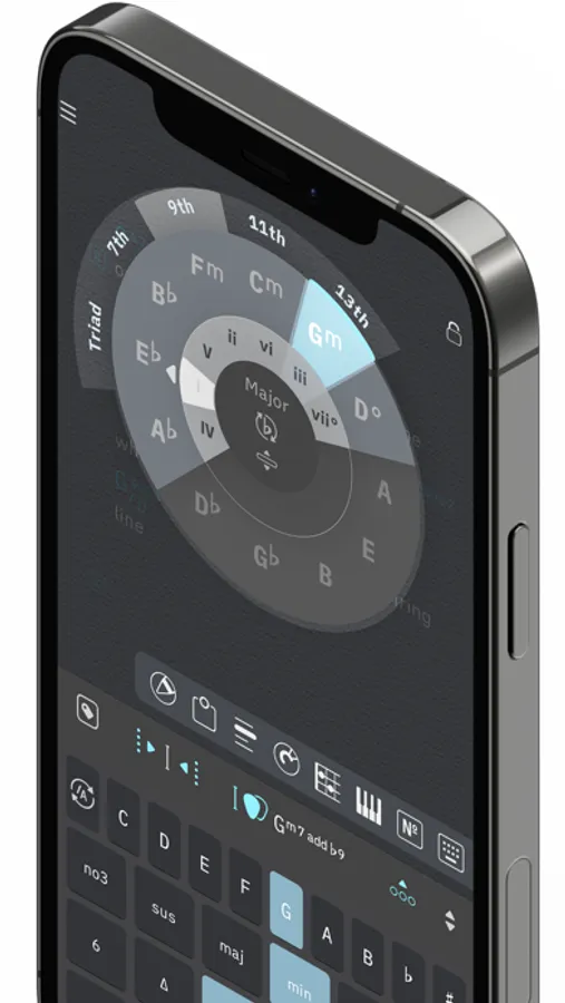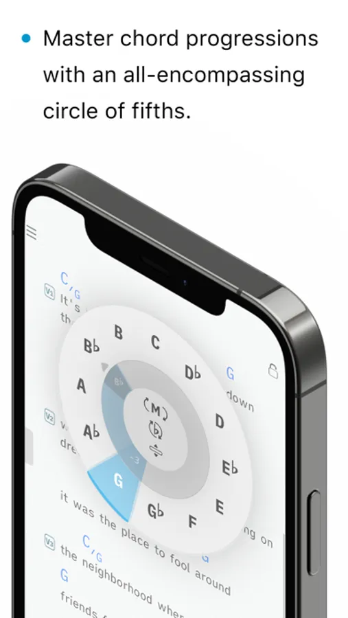 Effortlessly add chords to your lyrics with a smart chord matrix. Touch the desired notes on the virtual piano keyboard or fretboard to auto-generate all matching chord symbols with extensions and altered bass notes. Reposition chords via drag & drop and make editing lyrics a breeze with Song One's unique Focus Mode and dynamic chord spacing, which repositions the chords as you type. Find chords that sound great together and explore harmonic fields thanks to an integrated circle of fifths.
