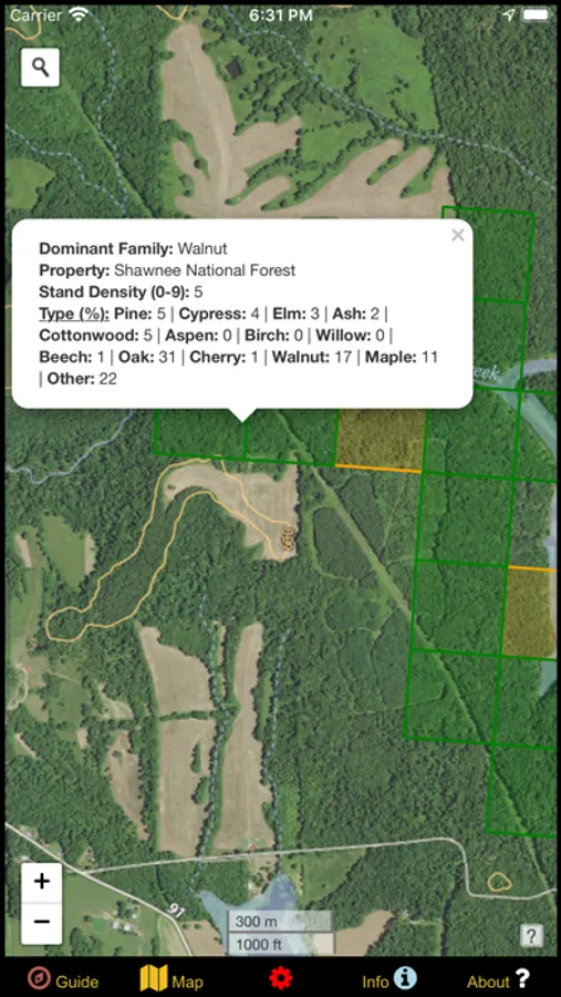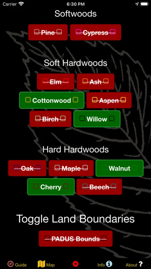 You can manually toggle given tree species on or off if you're an arborist specifically interested in forestry rather than mushrooms. This app is a great way to discover old forest stands or to learn how to identify certain types of trees by look. If you are interested in finding birch bark, oak acorns, apple trees, sugar maples, walnuts, or hickory nuts, just turn on a given layer and eliminate the guessing and frustration! Need some pine needles and cones for an art project? Pick from thousands of woodland patches laden with beds of them!