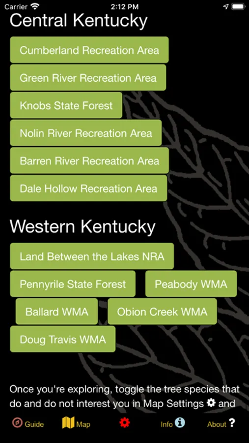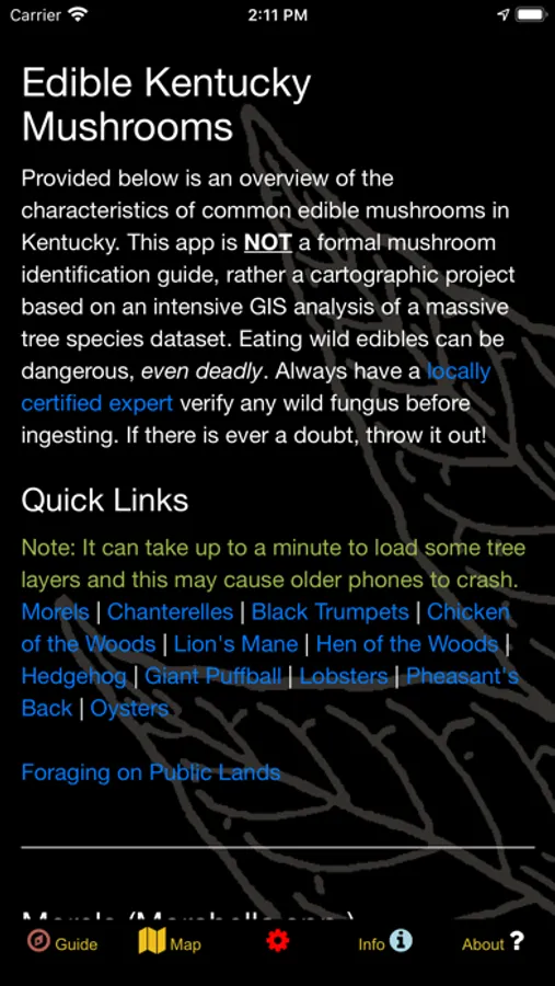 There is a wealth of useful information including descriptions of the different mushrooms and details on their characteristics. These sections even have buttons which will filter the map to show only tree species that are associated with a target mushroom! It is truly that easy...you want to find morels? Turn on the app, Show Morel Trees, and plot your GPS location to find the nearest forest stands where morels likely spawn.