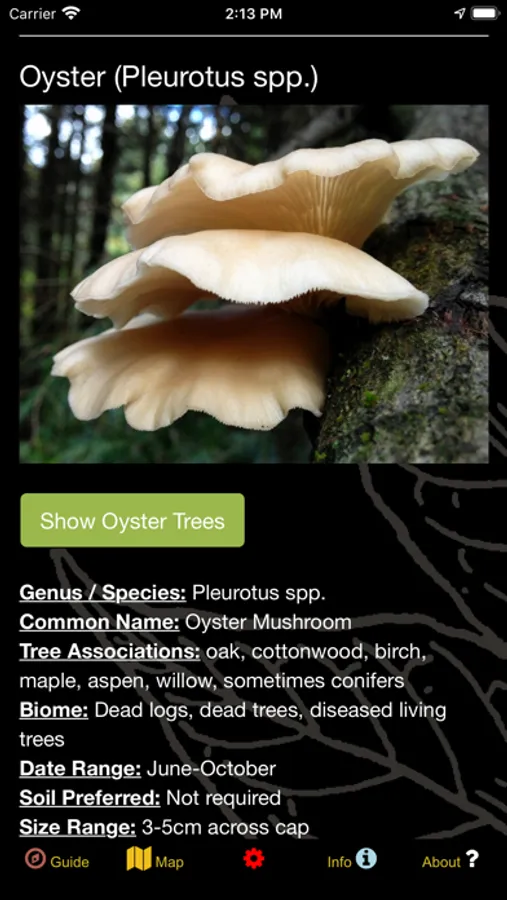It is a well-known fact that certain varieties of mushrooms tend to spawn in the vicinity of specific types of trees. This knowledge is what expert foragers use to reliably locate areas that produce mushrooms year after year. In this app, the relationship between tree and mushroom species is clearly outlined for 11 different edible mushrooms including Morels, Chanterelles, Black Trumpets, Lion's Mane, Chicken of the Woods, Hen of the Woods, Hedgehog, Oyster, Lobster, Giant Puffball, and Pheasant's Back.