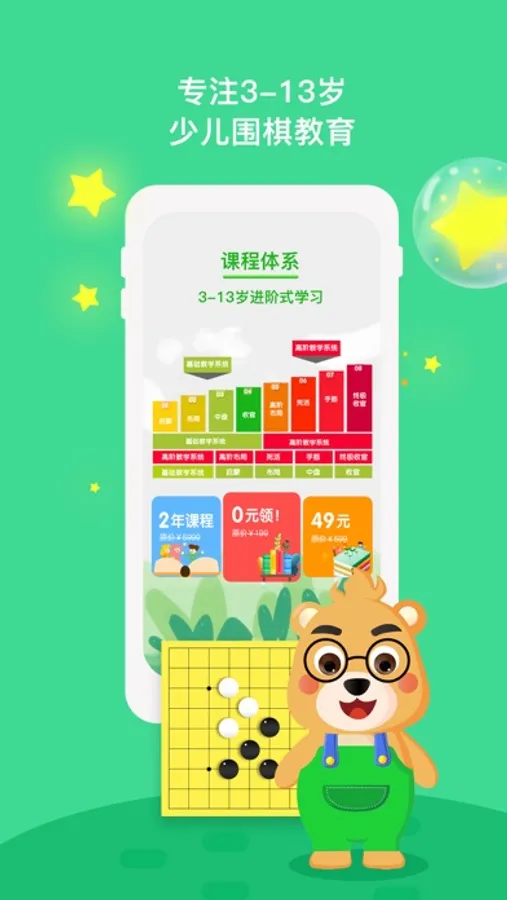 弈小熊围棋是市面上首款围棋一站式学习课程,课程设置贴合儿童成长特点。学习-练习-复习-实战,完整闭环式学习流程,保证孩子学习效果。
