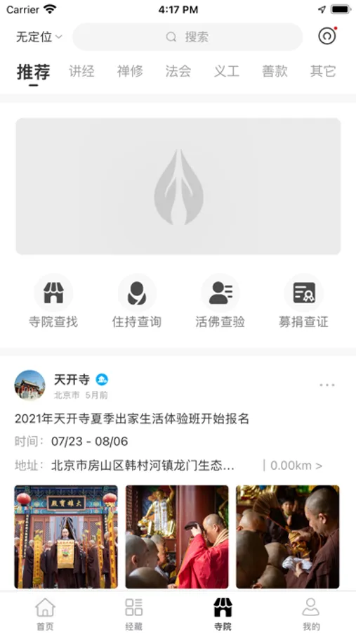彼岸app已经实现了活动、信息发布、用户报名、在线统计等。一方面,寺院可以依托彼岸app发布管理活动。另一方面,用户可以通过彼岸app主动搜索查找、报名参加感兴趣的活动。也可以按照类型、和位置距离分类查找全国各个寺院举办的禅修、讲经公开课、静心夏令营、放生、义工招募等活动信息。