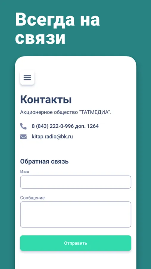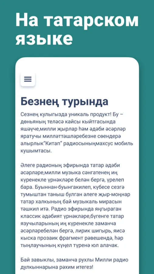 “Китап” радиосы мобиль кушымталар, Интернет сайт һәм Казанда 98,6 FM ешлыгына көйләнгән радиоалгычлар аша тәүлек әйләнәсе җырлап һәм сөйләп торучы Mилли радио.