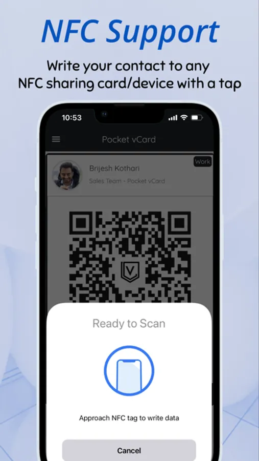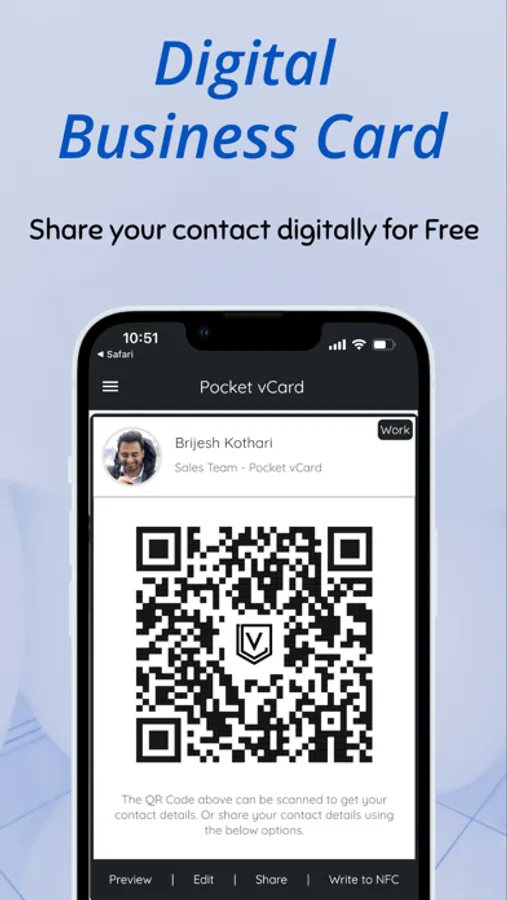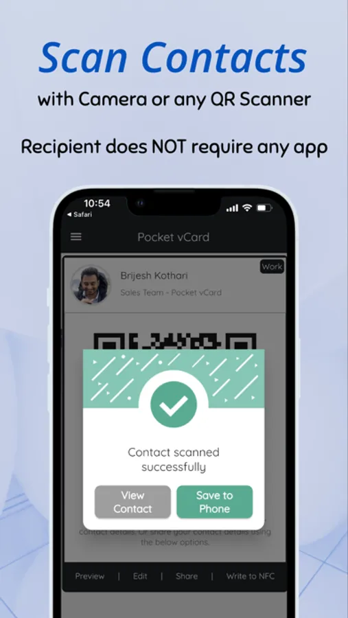 - Share via QR Code: Just show the QR Code in your Pocket vCard app and the other person can scan the same with their Phone using Pocket vCard app. That's it ! Your contact details are shared.