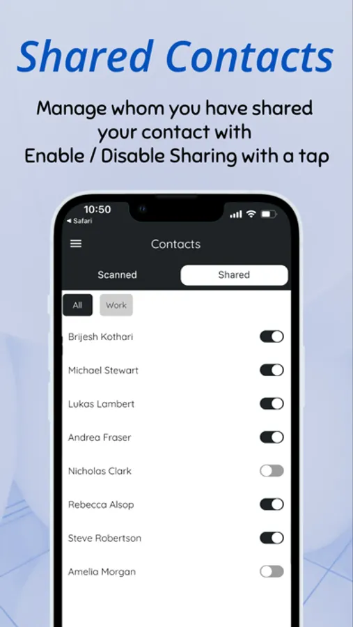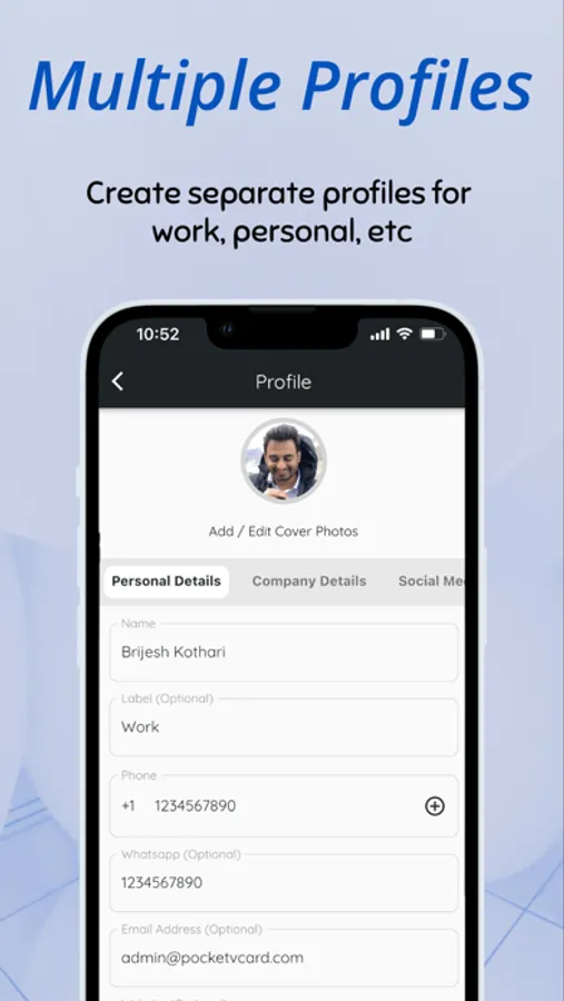 - Multi Profiles: Create multiple profiles with the details you like. E.g. create separate profiles for sharing work or personal contact info.