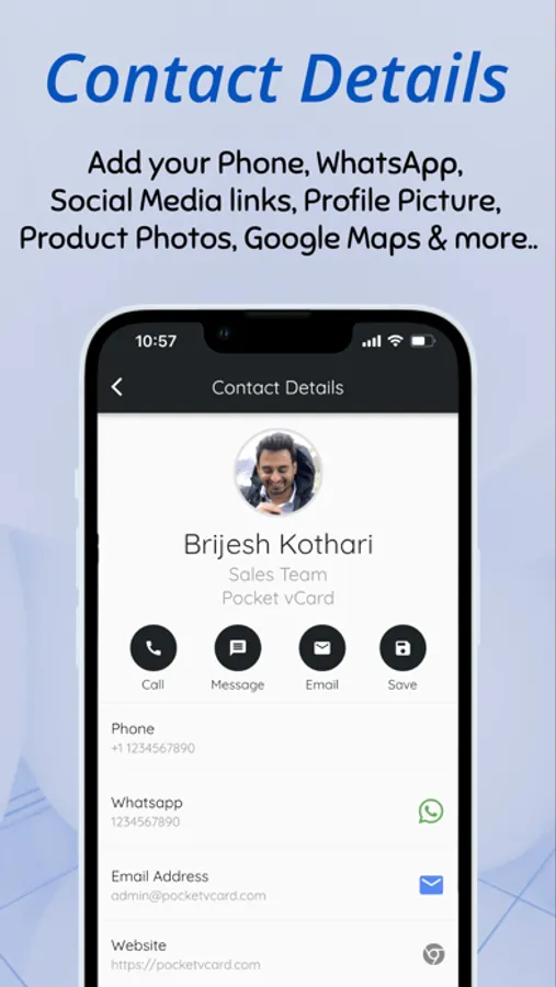 Pocket vCard is a drop-in replacement for traditional business cards. Physical business cards can be misplaced but the contact saved with Pocket vCard stays with you forever.