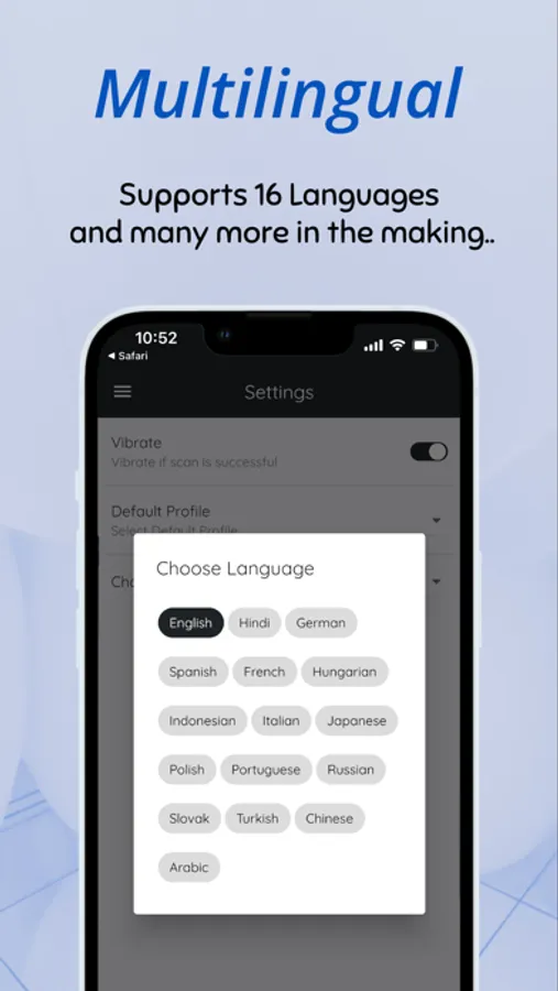 - Multilingual: Pocket vCard supports 16 languages English, German, French, Spanish, Italian, Russian, Japanese, Hindi, Turkish, Arabic, Hungarian, Indonesian, Polish, Portuguese, Slovak and Chinese.