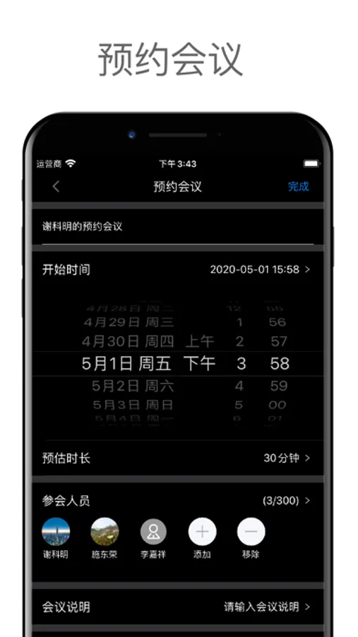 【预约会议】用户可以在预定会议界面填写“会议名称”、“开始时间”、“预估时长”等信息。(已登录状态下支持)