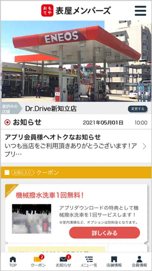 当社の公式アプリ「表屋メンバーズ」ではアプリで簡単に洗車・コーティングなどのご予約や愛車のメンテナンス管理が可能の他、当店で利用いただけるお得なクーポンや各種メニューの割引情報を配信しております。