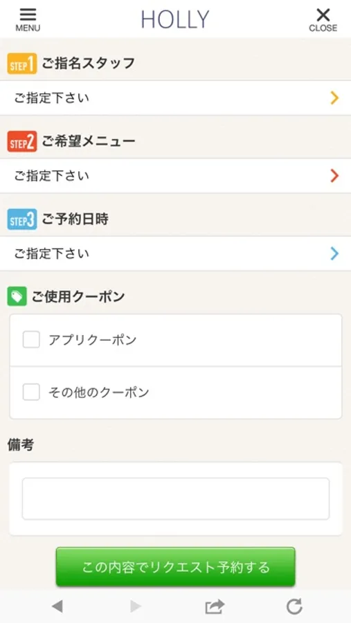 希望のメニュー・日時を指定して送信するだけで予約を依頼できます。