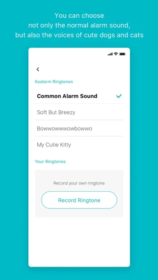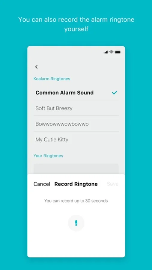 ∙ You can also record the alarm ringtone yourself. Make Koalarm your own app by pressing the Record Ringtone button.