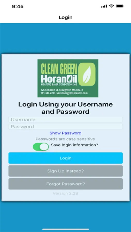 This is the Horan Oil Phone App. The application will allow users to view information about their account along with making payments on their account.