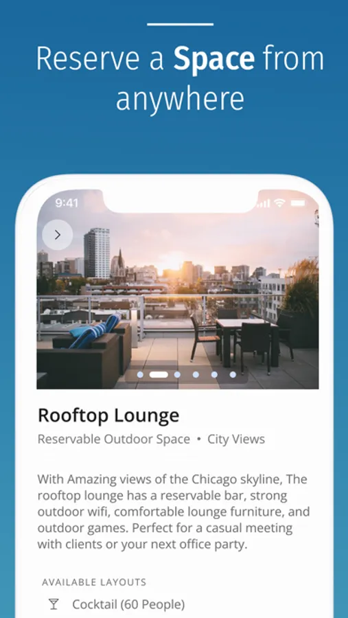 Quickly view information about on-site amenities, such as meeting space availability and food options, as well as information on building hours, Wi-Fi, and management contacts. View the building calendar for tenant events, nearby promotions, and building notices.
