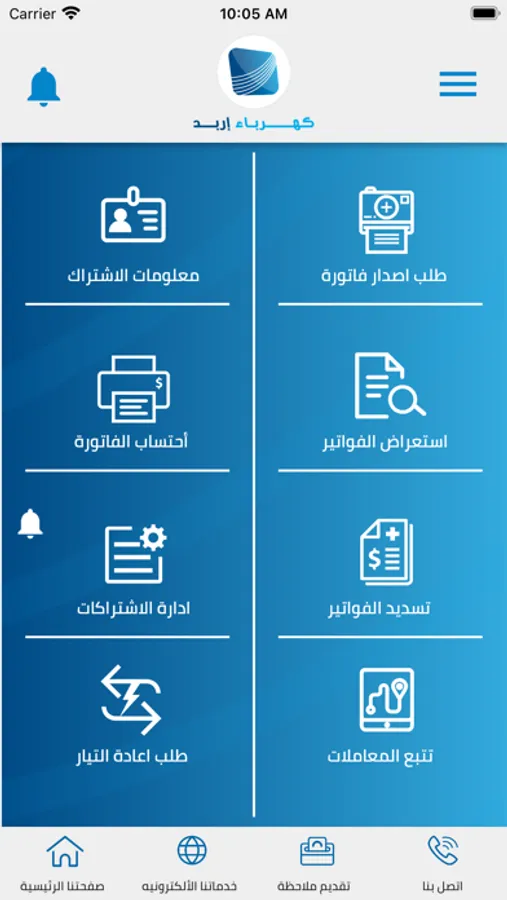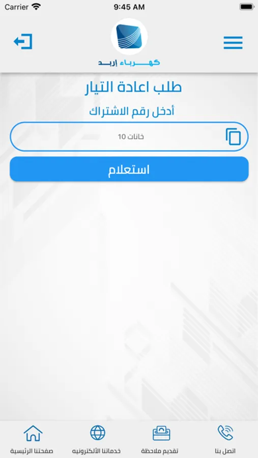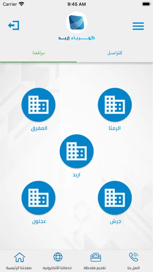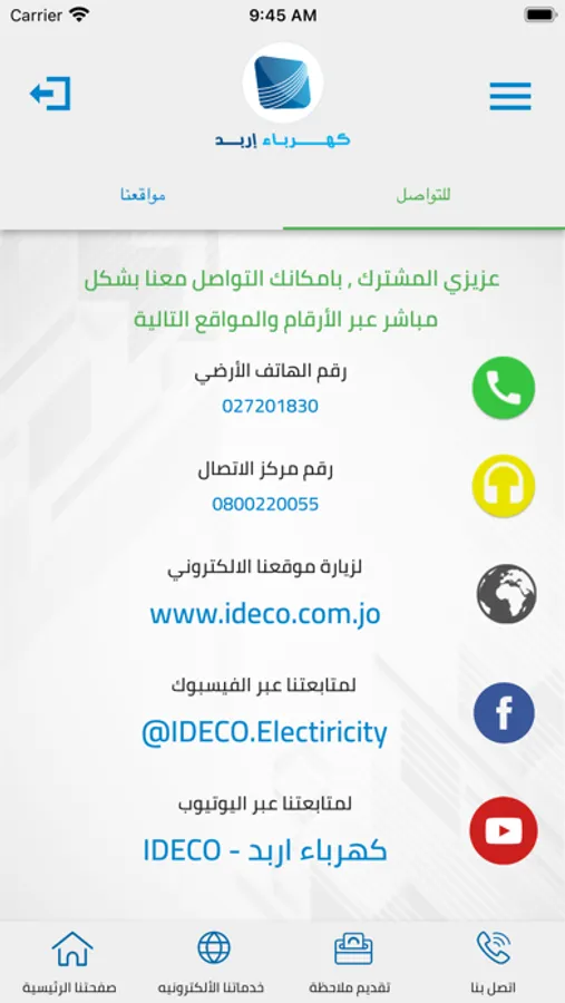 9- اتصل بنا : شاشة تحتوي على جميع بيانات الاتصال و المواقع التابعة لشركة كهرباء إربد.