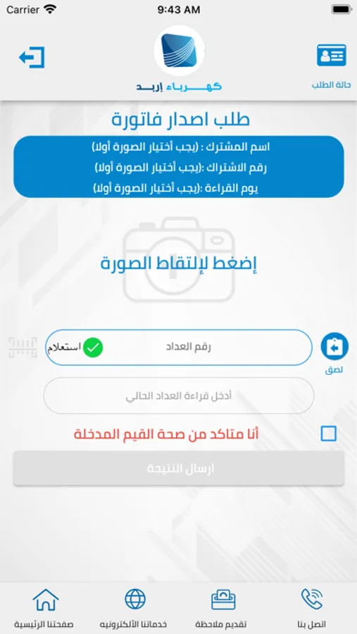 2- طلب إصدار فاتورة : يتم الطلب عن طريق تصوير العداد ثم يقوم البرنامج بالتعرف على رقم المشترك و يرسل الصورة للشركة من اجل إصدار الفاتورة.