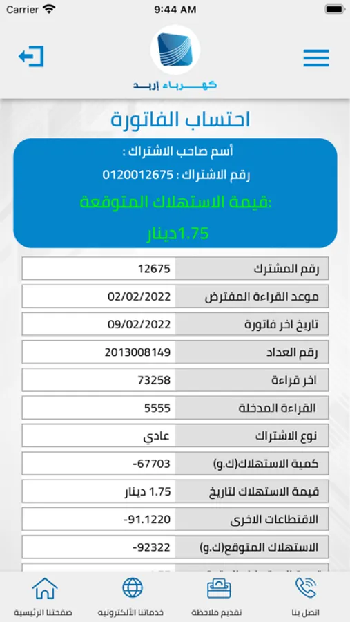 1- معلومات الإشتراك : تقدم هذه الخدمة معلومات تخص الإشتراك كرقم العداد و تاريخ القراءة.