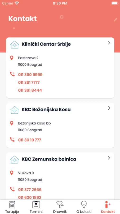 Aplikacija sadrzi i opšte podatke o bolesti i simptomima kao i listu sa adresama i kontakt telefonima kojima se pacijenti mogu obratiti.