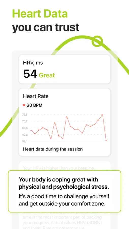 Stress, recovery, and fitness level show up in your body’s signals. Stress Monitor App takes into account your direct body signals, such as Heart Rate Variability and Resting Heart Rate and shows your current capacity to perform at your mental, emotional, and physical best.