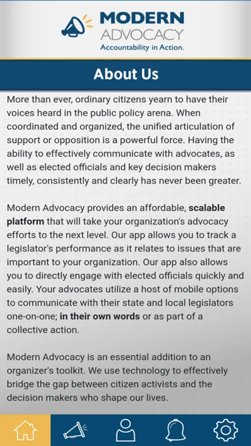 Modern Advocacy provides an affordable, scalable platform that will take your organization’s advocacy efforts to the next level. Our app allows you to track a legislator’s performance as it relates to issues that are important to your organization. Our app also allows you to directly engage with elected officials quickly and easily. Your advocates utilize a host of mobile options to communicate with their state and local legislators one-on-one; in their own words or as part of a collective action.