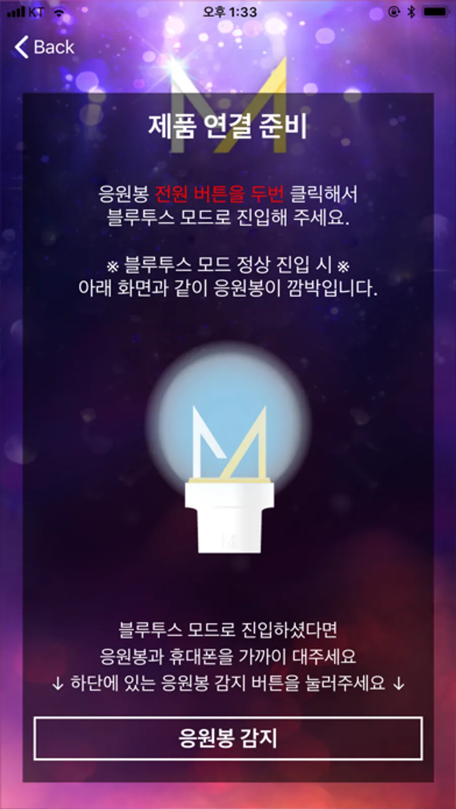 응원봉 전원을 키고, 버튼을 두번 눌러서 블루투스 모드로 진입해 주세요.