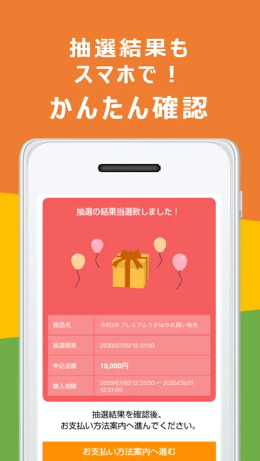抽選日になると当選結果をメールで通知し、アプリ内で商品券の操作が可能になります。