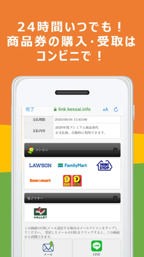 商品券の購入はコンビニで、24時間いつでも手続きできます。購入した商品券は、プレミアム分を加算した金額にてアプリ内にチャージされます。