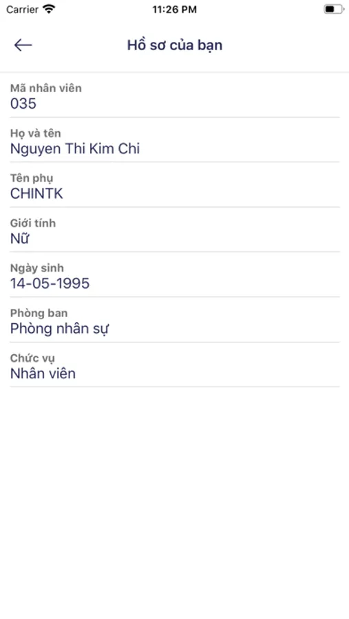 THÔNG TIN NHÂN VIÊN - Xem thông tin hồ sơ của nhân viên và hỗ trợ bộ phận nhân sự có thể Khai báo ảnh nhân sự qua ứng dụng
